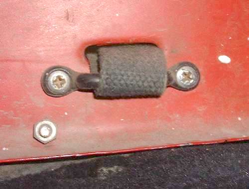 The pictures below come from my 1958 Roadster (built in August 1957). This has small brackets which look like miniature drawer pulls attached to the front face of the bulkhead panel with grommet head screws. The tool roll strap is passed through the slot in the bulkhead, wrapped around the bracket, and passed back through the same hole in the panel.