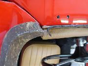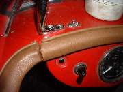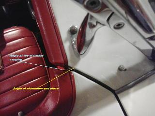 This is a note for concourse enthusiasts as well as a warning for fitment if you start mixing mismatched parts. Early in MGA production there were three different treatments for door top trim rails, and two different cockpit front trim rolls. The earliest parts were all wood, and the mating ends were angled to be tangent to the joint between door front and top body cowling, as shown in the picture at right. -- (This picture is compliments of Terry Sheppard in Hampton, Victoria, Australia).
