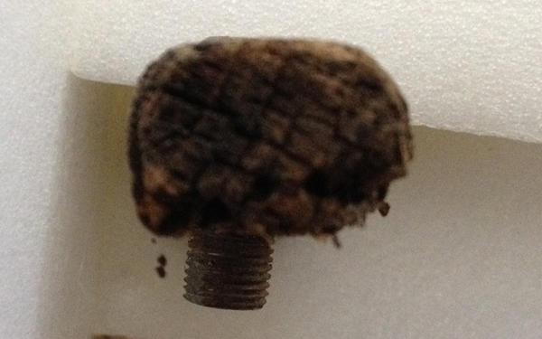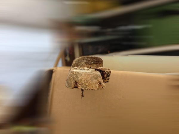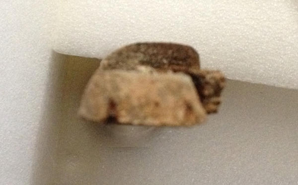 "Here are some photos of an original but weathered piece. There is a corner broken away/missing from the end that attaches to the metal piece, it should be full width.