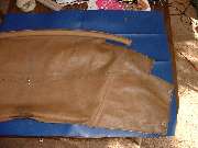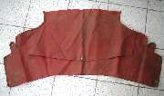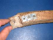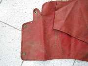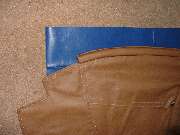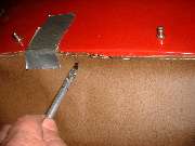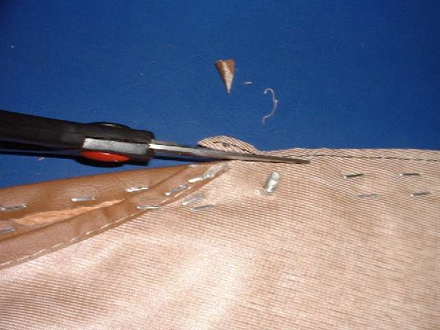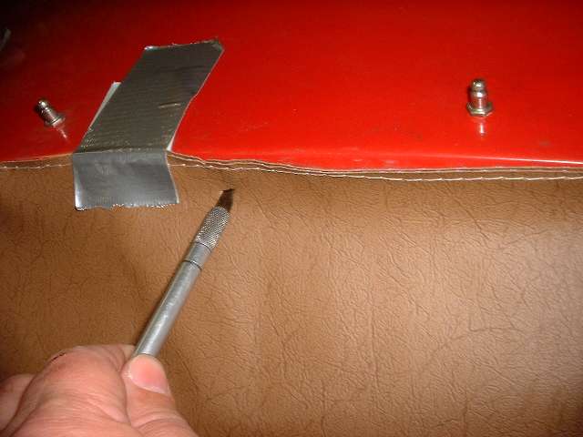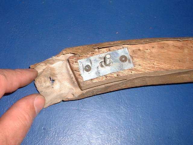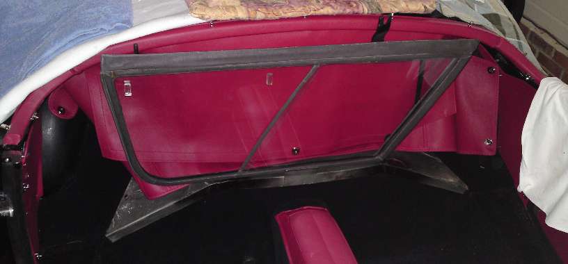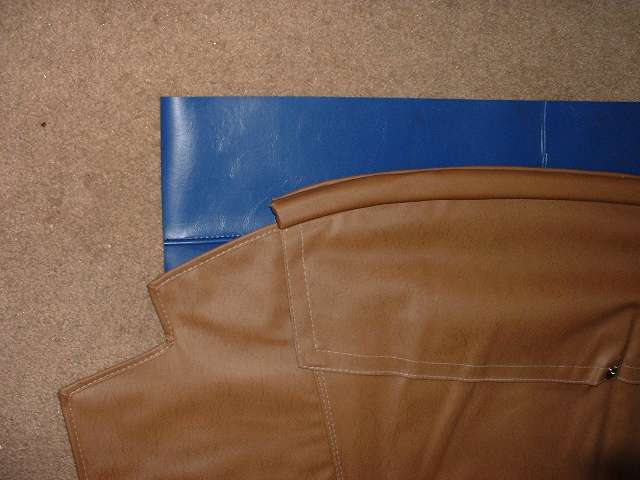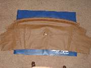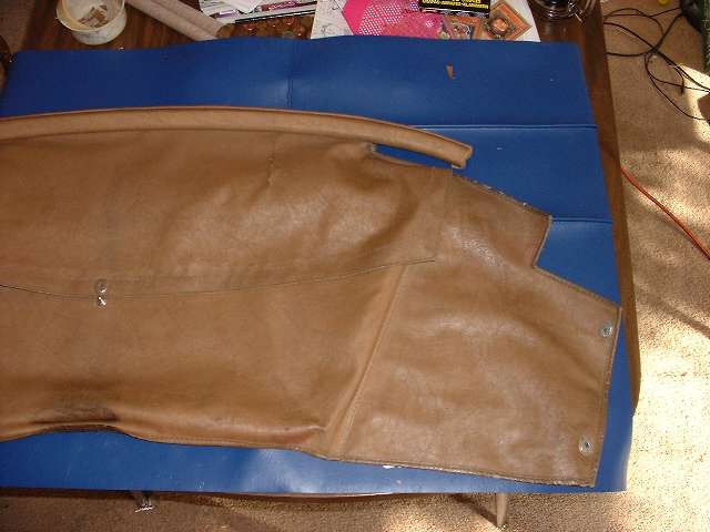 Stripping the old covering from the rear rail you should find a solid wood rail with five flush metal plates in the back holding floating studs, the same parts as are used on the door top rails. You may or may not need to replace some of these studs. The only admonition here is to steer clear of the metal plates when driving tacks or staples, and maybe buff off any sharp corners on the ends of the rail. Recovering the rear rail goes pretty much the same as the front rail, but no worry about metal end plates. So I will skip all of that, except to tell you not to install the trim piping until after the side curtain stowage bag is installed.