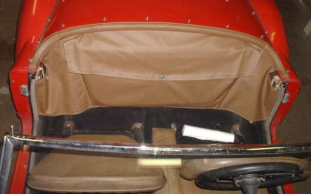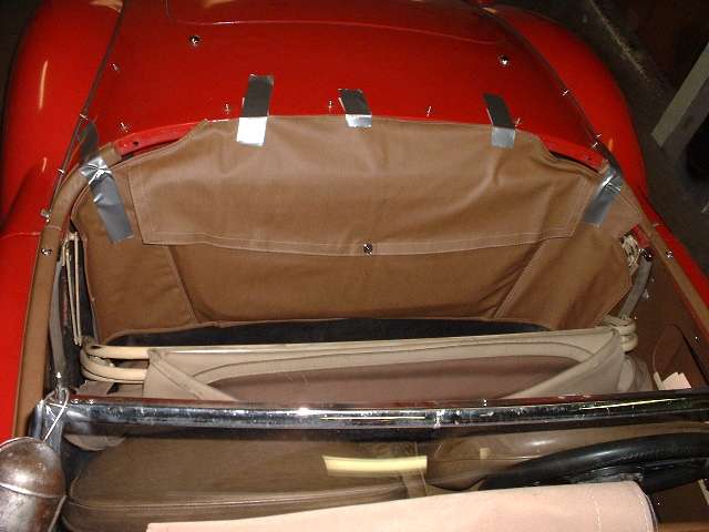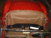 Here is a picture of the late production 1600 type car with the stowage bag sitting on top of the battery cover (and later articulation style top frame). I don't know what the factory had in mind here. I have tough enough time fitting mine in under the cockpit trim roll with the bag just touching the tunnel carpet.
