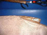 With the bag secured to the back of the rail, trim away any excess material extending above the top edge of the rail. Not to worry about cutting off the stitching line, as all fabric layers of the bag are securely stapled to the rail. When trimming is finished, install the top edge piping in similar manner as with other trim rails, snug against the side of the rail, flush at the back, and folded in at the ends.