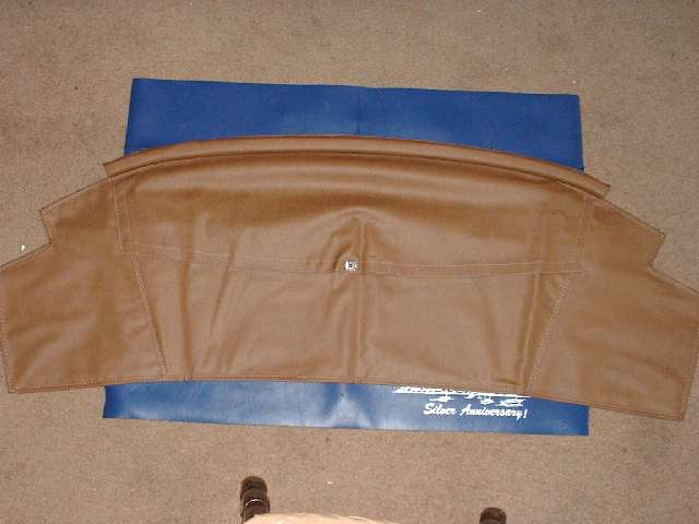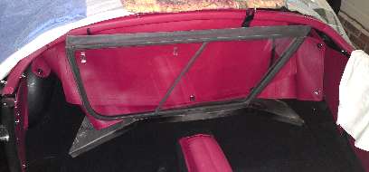 Here you see the finished rear trim rail with the side curtain stowage bag attached, ready to be installed in the car. Nothing could be simpler, just hold the rail in place on the rear body tonneau, install a flat washer and lock washer and hex nut on each of the five studs, align ends of the rail with adjoining corner rails, and tighten the fasteners.