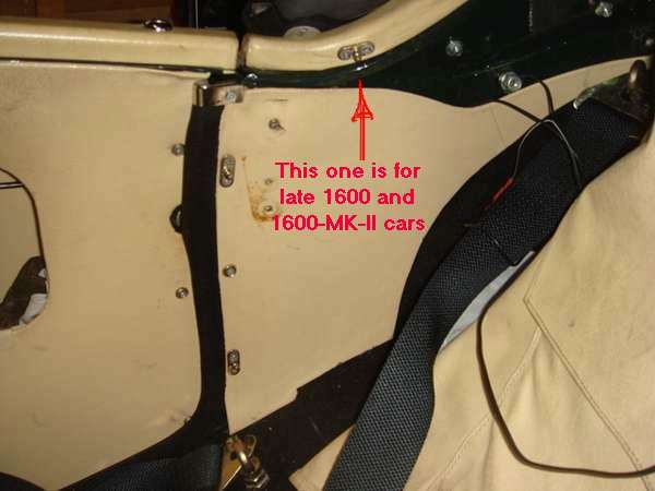 All finished with the installation, put the side curtains back in the bag, upside down with hooks to the back, and button down the front cover. If you want to, you can install Lift The Dot studs and fasteners at each side flap of the bag to secure it to the inside wall just behind the door weather strip trim piece. There would be two flanged LTD studs each side for the 1500 and early 1600 style bags, and three fasteners each side for the later style installation (photo below right). The top stud is 3" down from the top of the chrome cap, and the next one is 7" lower. The third stud (when used) is on the cockpit corner trim roll 3" back from the front end.
