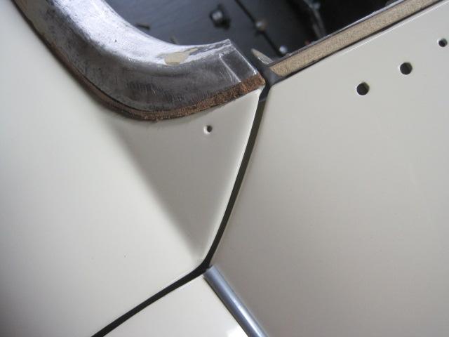 My concern was that the difference in thickness, when covered and installed in the car, would be noticeable. That turned out not to be the case. As with the rear, I fitted the wood to the car, making the angle at each end match as closely as I could the previously covered and installed door rails. Since I was using the original fasteners, I had to rout out the wood for some of them so they would reach through the bodywork.