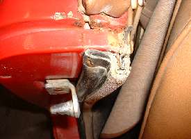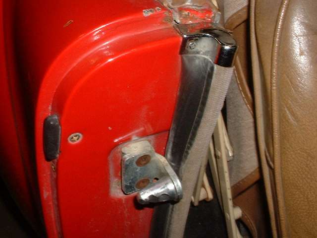 Notice the tubular cross section of the rubber part of the seal. When new these tubes were nearly round like a rubber hose. Near the striker plate the rubber part would completely fill the space between the body flange and the striker with additional interference fit. On one side it would be trapped between the plates of the lower hinge and had to be cut away to clear the hinge plates to allow the door to close at all. The tubes were so fat that it was nearly impossible to close the door, even using considerable force. I had the hinges and latches adjusted for maximum gap and still had to slam the door hard with two hands to get it to latch. This was so severe that the car soon had dents in the door skins near the top rear from the force of the heel of my hand when slamming it shut from the outside.