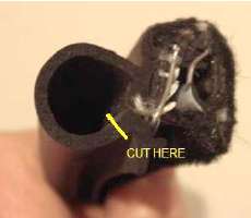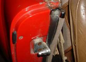 When driven on a rough road the latch would pop loose. When the latch pin and/or striker became a little worn it would pop loose a lot easier and more frequently. I was installing a new striker on the driver side about once a year (~10,000 miles), and changing the latch or latch pin every second year (~20,000 miles). With time the tubular seal eventually took a compression set in a more squashed position, but it never did relax enough to allow normal closure of the door. After 10 years and 100,000 miles I could usually close the door on the first hard slam without denting the door skin. After 20 years and 200,000 miles I could close the door with a firm slam with one hand, but it would still pop the latch regularly on a rough road. I was so happy the day that I finally removed these door seals and installed the correct thinner FurFlex and foam rubber seals (see next page).
