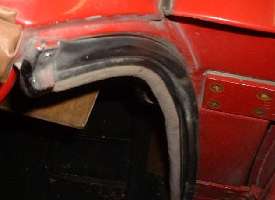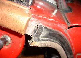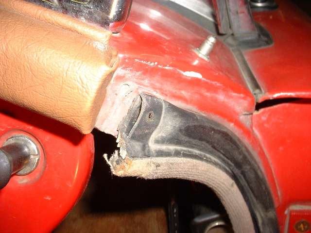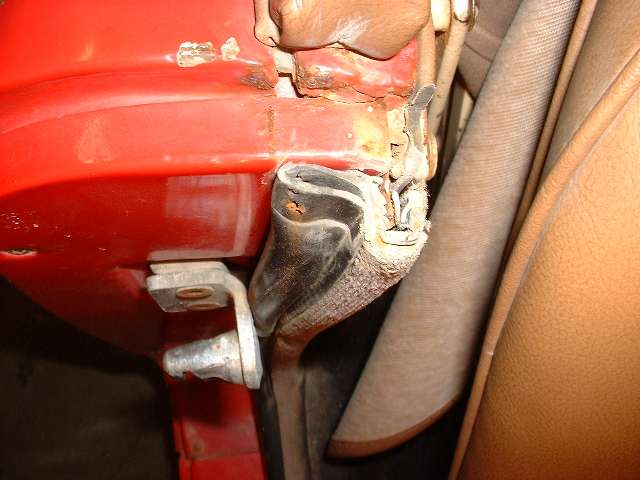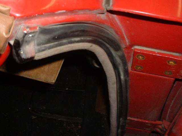 These photos show incorrect tubular door seals which I struggled with for many years after first restoration in the mid 1980's. These photos were taken after 20 years and 200,000 miles of service. The pictures show the top ends of the door seals, the first two with the end caps in place, and second two with end caps removed.