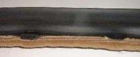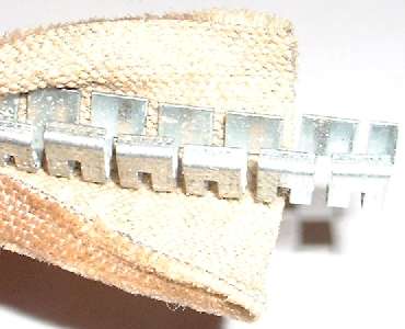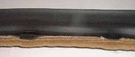 Click for larger pictures. The picture above left shows the FurFlex door seal assembly as received from Clarke Spares. The picture on right shows the fuzzy cover material unwrapped to expose the flexible steel spine. Note that the spine is asymmetrical having a short flange formed inward on one side. The soft rubber seal piece is also asymmetrical having a curved back and fold on the insert edge. The edge of the rubber fold will be tucked inside the flange of the spine. If you receive these parts disassembled (from some source other than Clarke Spares) you can press the folded edge of the seal into the fur covered shell using the blunted edge of a wide putty knife, being careful not to tear the foam rubber.