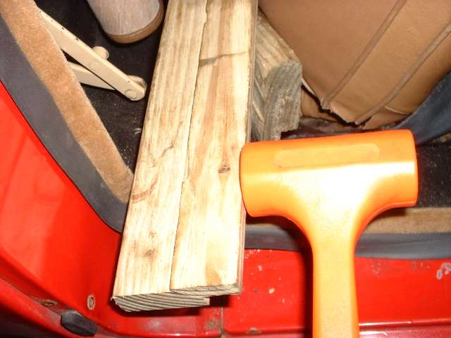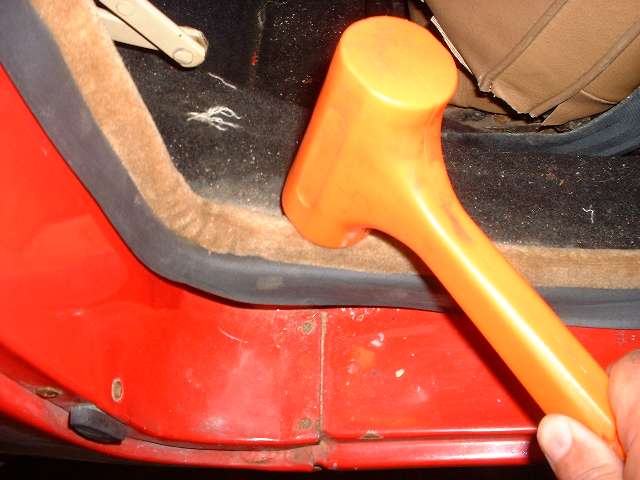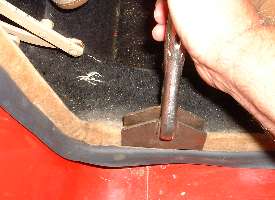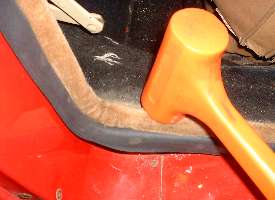 The Clarke instructions say you can push the seal onto the body flanges with your hands, and that you shouldn't hammer on it. The vertical runs where there are only two layers of sheet metal (0.096" plus paint) go on easily with a gentle push. However, where there are three layers of metal in the flange at the bottom (0.144" plus paint) I found a bit of a nudge with a light plastic faced dead blow hammer was the proper finesse. Where I wanted the seal to make a nice tight turn at the sharp corners I used a wood block in the corner with a few gentle thumps.