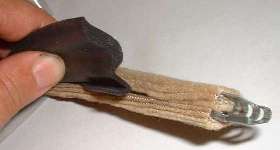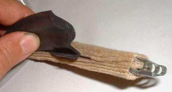 At left we have pictures of the steel clips which are to be installed inside of the assembly. These parts are a symmetrical flared "U" shape with the small triangular points formed inward to grip the steel body flange. If you receive your parts with these pieces loose, you can install the clips by pressing them into position with the edge of a putty knife after the rubber seal is in place.
