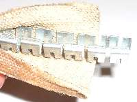 One edge of the clip will snap in under the flange on the spine. The picture at right shows two clips installed. The clip on the left is not quite all the way in and has the edges showing. The clip on the right is all the way in place and has the edges completely hidden after snapping in under the flange of the spine. Starting at the seal end which will be at top of the latch post, put the first clip two inches from the end of the seal. Then install 20 more clips at three inch intervals. This arrangement will have the clips positioned to either side of the two bottom sharp bends, not in the corners.