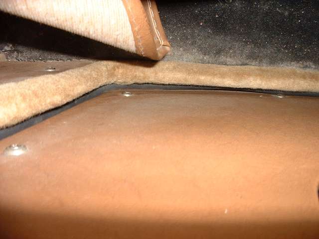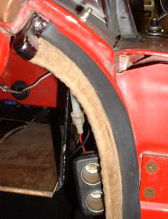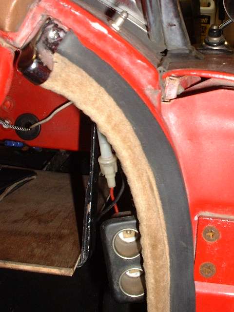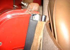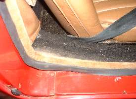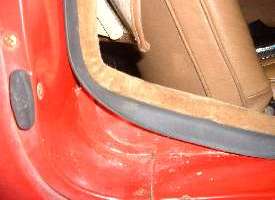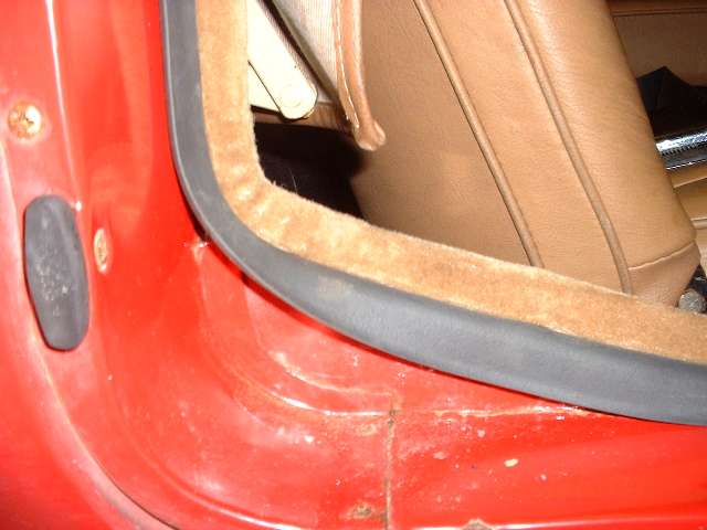 Picture above left shows how the rubber flange will stand outward from the vertical body plate where it makes the rear turn when first installed. This is no problem at all. The run up the vertical post has the rubber at right angles to the body flange. The run just ahead of the turn wants the rubber to lie flat in the same vertical plane as the body flange to lie against the inside surface of the door trim panel. A little farther forward it transitions back to lie again at right angles to the mounting flange along the bottom of the door. When the door is closed the rubber will take a set in the correct desired position. Picture above right shows the condition of the seal after the door has been closed against it for one day.