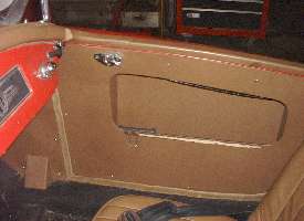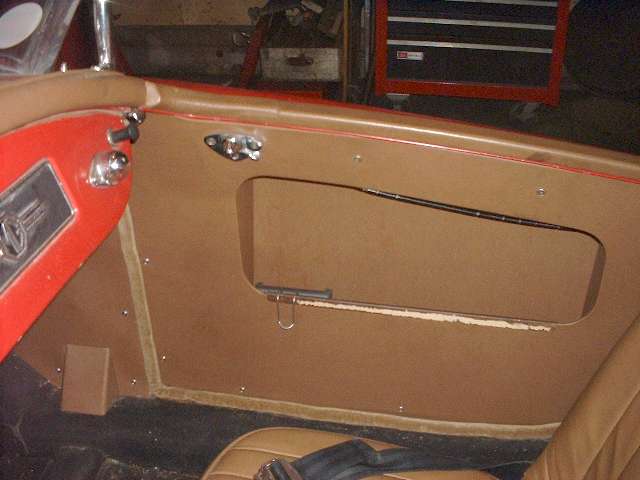 report that it closes easily, and that I can lean against the back edge of the door to make it latch without slamming it at all. The rubber seal makes good contact all the way around with no gap anywhere. Since I can now close and latch the door with a mild pull with one hand I have hopes that there may be no more popping of the latch on rough roads. This is looking pretty spiffy, so now I need to paint the panel reinforcement bar again.