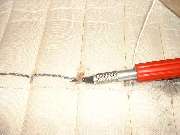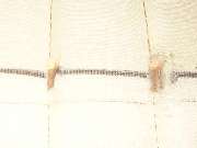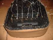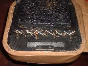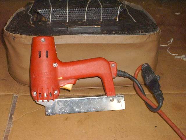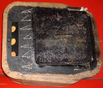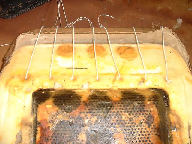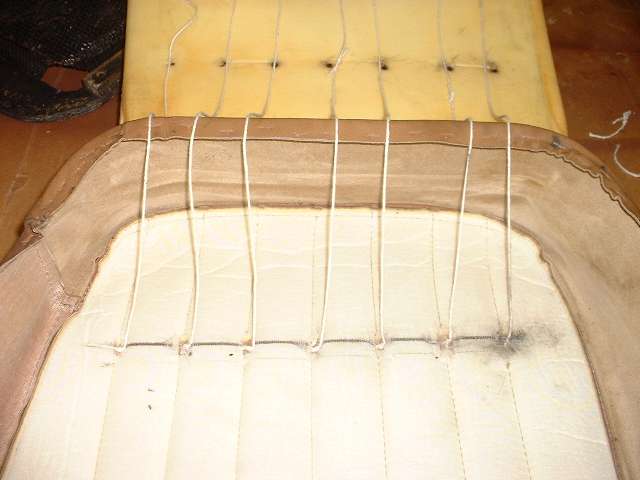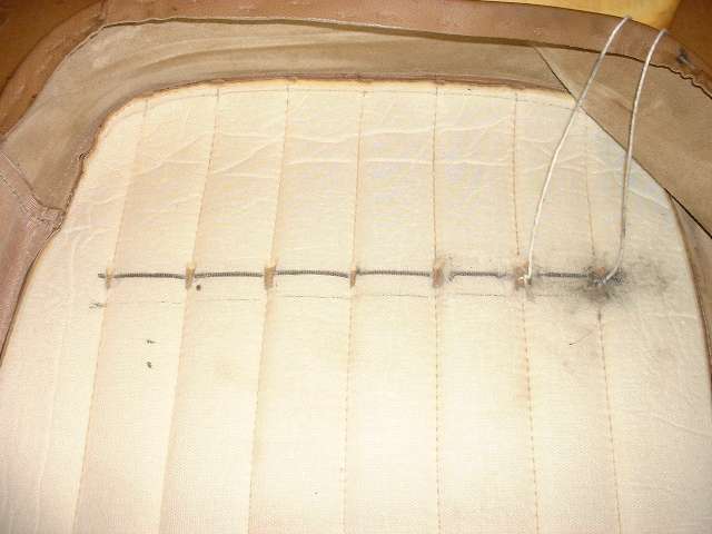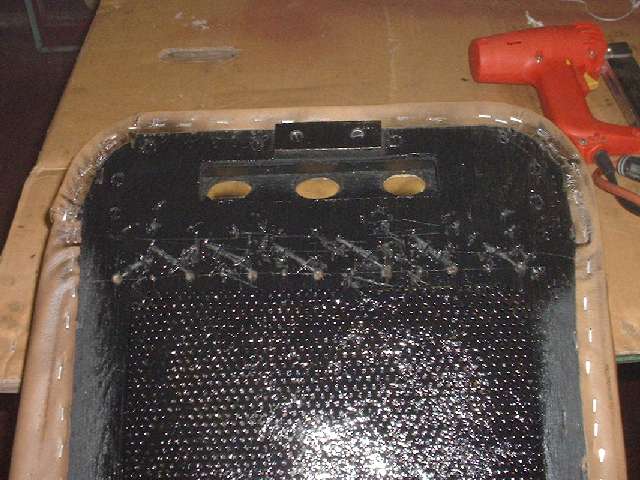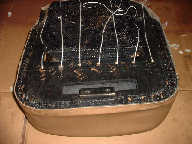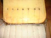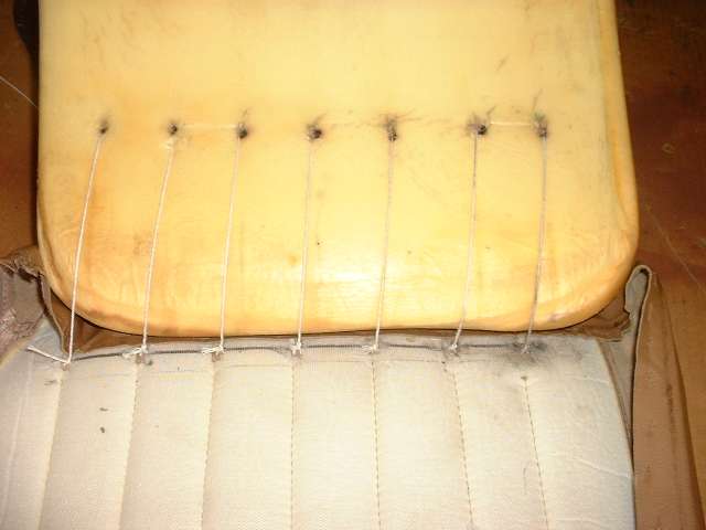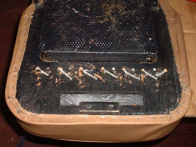 The depression of the cover fabric then follows the molded contour of the foam cushion. Without the strings in place the fabric would just stretch flat across the top. A touch of black paint on the bottom side will camouflage the strings nicely. Not that anyone would ever see it later, but the paint may also help to preserve the string if it might get wet with rain and damp carpet. The strings I installed in 1986 lasted through 18 years and 193,000 miles including one additional R&R of the covers to install new foam buns in 1997. Pictures on this page show a 52 year old screen, 32 year old base board, 13 year old cushion, 4 year old leather and vinyl cover, and new strings.