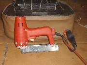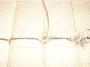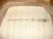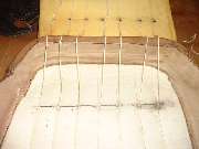 After the cover is completely fastened in place, then pull the strings to form the lateral pleat in the top cover, and attach the strings underneath. During this process I find it convenient to install some small wood screws or carpet tacks left slightly high to serve as binding posts for the string. Pull the strings one by one while pressing gently on the cover at top, determining the final tension and position you want on the strings to produce a pleasing shape for the lateral pleat. Wrap the strings around the screws for temporary holding until you have the final form on top. When you have it all in place where you like, then tack or staple the strings permanently in place underneath. Removing or flattening the binding posts is optional. Photo above right shows the binding screws still in place after final attachment of the strings. Photo below left is after the screws were removed.