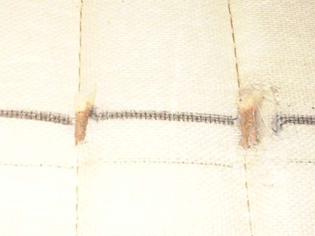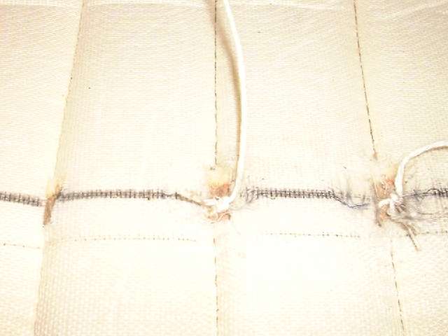 Place the cushion on the base and test cover it with the outer seat cover. Determine where the lateral pleat will fall, and make a matching reference mark on the inside (underside) of the cover. Five inches form the front piping should be spot on. Use a razor knife to cut small openings in the overlying fabric about 3/16 x 1/2 inch straddling the stitching lines to expose the sewn together flanges of the outer cover. Poke a hole or cut a slot through the flanges, being careful not to break the stitching holding the flanges together. Push a heavy string through the hole and tie a square knot to secure it. Cut the string to at least one foot in length (string is cheap so maybe longer is easier). Repeat for all seven pleats.