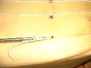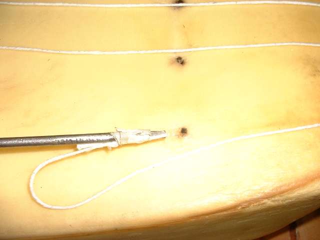 Place the cover securely on the cushion to determine where the knots will fall, and mark those locations on top side of the cushion. Place the cushion on the base board to determine where holes in the board fall, and mark those locations on bottom side of the cushion. Use a long skinny screwdriver to poke holes through the cushion from top to bottom marks. Place loose end of string over tip of screwdriver and tape it in place, then push the string through the matching hole in the cushion. Peel tape off at opposite side, and repeat for all seven strings.