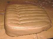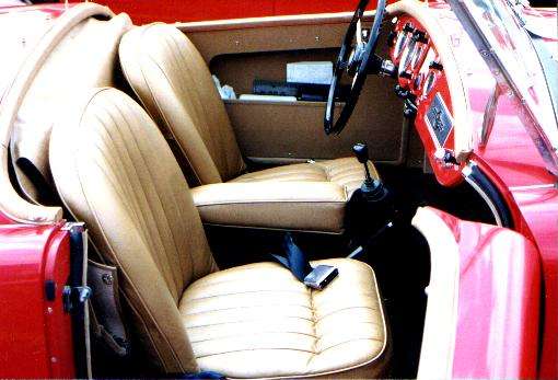 The large photo here, notice the lateral indent in the bottom cushion cover about 5 inches back from the front. I might have a hard time proving this, but I believe this is original factory style. My original late 1957 seats were like this prior to restoration in 1977, as well as the 1956 MGA which I owned in 1968. I have seen a couple others like this which appeared to be original.