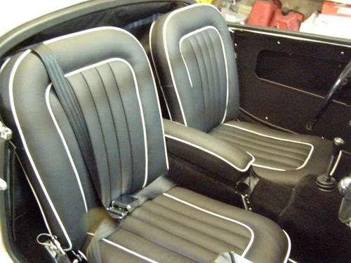 The Competition seats assemble more like the MGB seats. These do not have the wood baseboard structure, but use webbing stretched across the base frame with the foam cushion resting on the webbing. The foam seat cushion is different, as well as the backrest padding. See several pages to follow.
