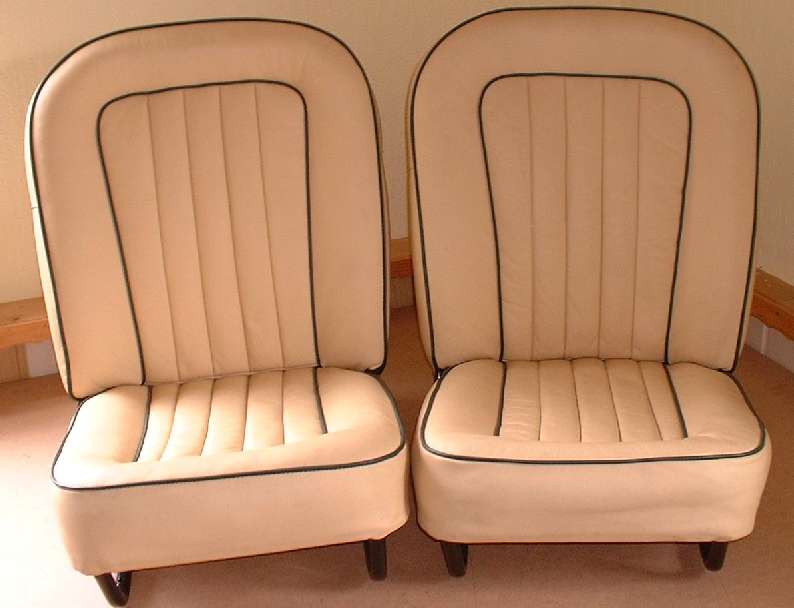 Once you have the appropriate back frame for each seat type, the Roadster and Coupe seats can use the same bottom frame, bottom board structure, and molded foam cushion. They can also use the same backboard and horsehair inner pads with appropriate trimming to fit the frame shape. The leather covers will have a different pleating pattern as shown above, but otherwise the Coupe seats assemble in the same manner as the Roadster seats.