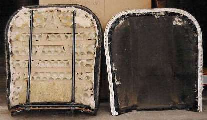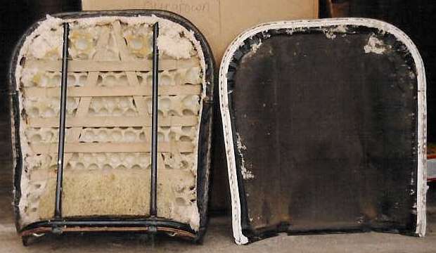 What is NOT shown here is a heavy card stock backing board which wraps around the back of the backrest frame, similar the standard seats. This should also be covered on the back with a thin soft cloth pad prior to installation of the outer cover. This may possibly have been felt, which makes a good replacement, but was more likely originally a soft woven layered cloth pad.