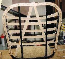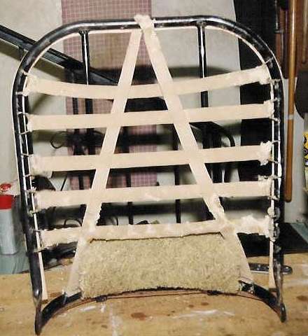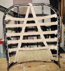The next picture at right is the same base frame, detached, with the leather cover which was removed from the back frame. Notice the slight angle on the base frame on the side which goes next to the tunnel, wider at the back and narrower at the front, similar to other MGA seats. The heavy cloth webbing is looped around and stitched onto steel wire clips which hook into small holes in the tube frame. The contoured foam rubber seat squab is supported on the webbing, and the outer fabric cover will be stretched over everything.