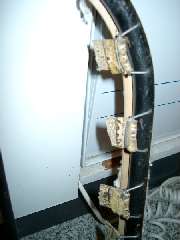 Above we have two pictures of the driver side backrest (LHD car). On the left the front side, and on the right the back side. Here the web straps are layered (not in basket weave). The horizontal straps are installed first, then the angled vertical strap is looped over the top tube and laid in front of the horizontal straps. All strap ends are sewn onto wire hooks to attach to the tube frame (picture below). At the bottom is a small horsehair lumbar support pad about one inch thick, similar to the pad used in the standard seats but not as tall. With the cloth and cushion removed you can see the wood tack strips which are screwed onto the back side of the backrest perimeter frame.