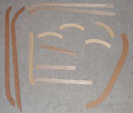 Starting with the picture at right we see bottom cover and foam pad removed, and the face of the back cover stripped away. The vertical pleated piece is the remains of the thin cloth covering on a cotton pad which was once attached to the inside of the pleated leather face cover. Behind that is a thick molded foam rubber cushion similar to the base cushion. Like standard Roadster and Coupe seats, these will be covered with leather on the front surfaces and on the most accessible side surfaces, and vinyl on the less accessible sides and across the back.