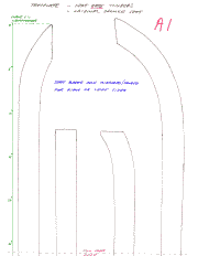 "The following templates are taken from my original MG factory seats (Newton seat timbers are slightly different). You can print these in actual size onto A4 paper. Sheets A1 and A2 to be joined together along dotted red line (and similarly for B1 and B2). Your finished timber pieces should fit within the solid black lines (as I made these templates by drawing around the original timbers). The green scale line should help ensure that your printer has printed correctly to 100% size.