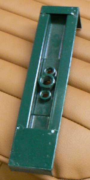 Photo above right shows an aftermarket adapter/repair piece available from Todd Clarke Restorations. This piece is to fit between the body rear cockpit rail flange and the rear bulkhead, just inboard from the inner fender, same location shown in the first photo. This new piece is a duplicate of the original MK-II body part (except for an extra center threaded nut). The additional large center nut allows attachment of a single-bolt belt end. Photo at left shows it installed.