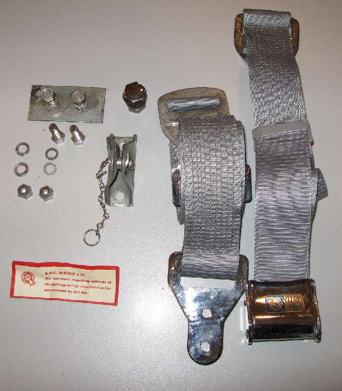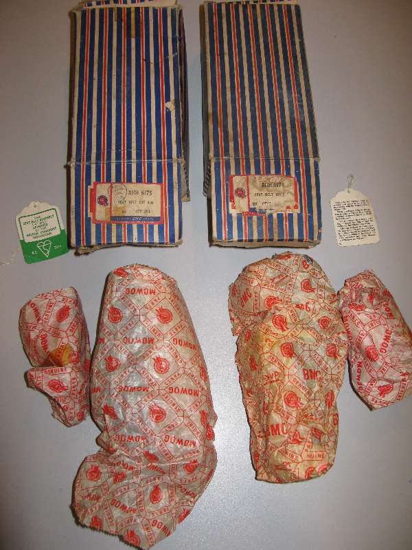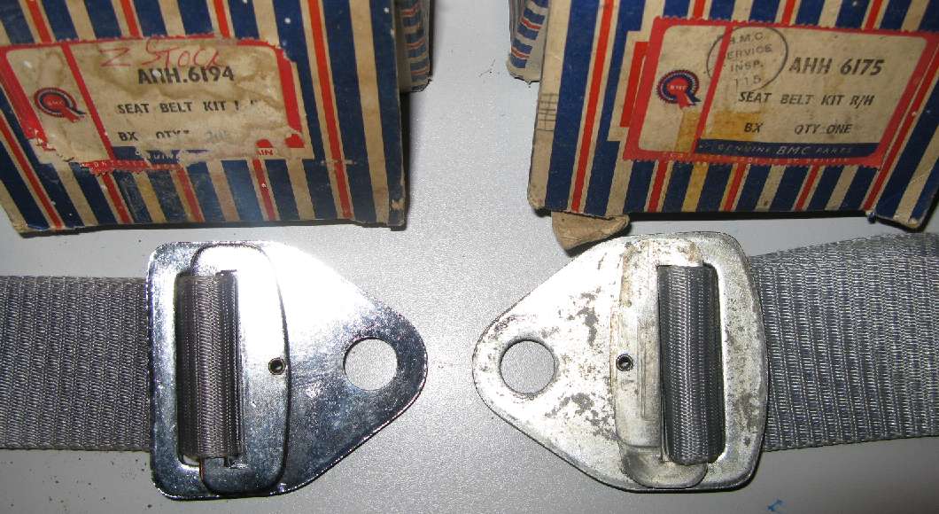 Now for a bit of a chuckle, see picture above. The only difference noted between the left and right hand belt kits is that ONE of the anchor ends on one side only is zinc plated while all the rest of the metal parts are chrome. That may only be a difference in production date, if for instance plating was changed from chrome to zinc as a cost reduction. So far no other clue why the RH and LH part numbers are different, or why only one piece was not chromed (perhape a production error).