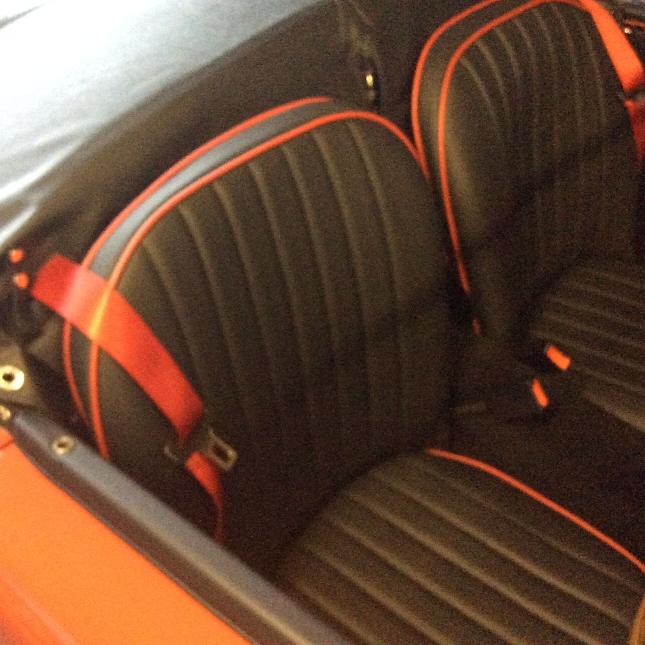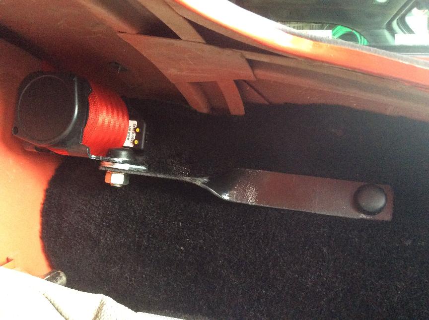 I wanted to install modern 3-point inertia belts with push-button stalks, as the most effective and user-friendly restraint system available. The challenge with this installation in an early MGA is that the inertia reels must sit in a horizontal position on the rear wheel arch in the boot area, and the belts then thread through the bulkhead into the cabin over the drivers shoulder, going over the folded hood en-route. So the sill fixing in the cabin must be an eye bolt to allow the belt to be released in order to put the hood up. Further, if, like me, you are in the habit of tucking the tonneau down behind the seats when driving (rather than taking it off completely) the tonneau needs some surgery to thread the belt through it when it is in that folded and driving position. In other words, - achieving a neat and usable installation takes a lot of fiddling about and imagination.