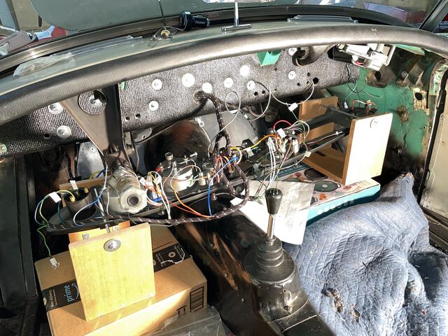 - Offer the dash up to the body momentarily for correct orientation. Sit on the tunnel with dash face down on your knees (or some boxes on the floor) while you connect all wires of the main harness to the dash component terminals. One last wire with bullets connects with a snap connector between dash harness and main harness. If no heater or heater control switch, then install snap connectors to protect those bullet wire ends.