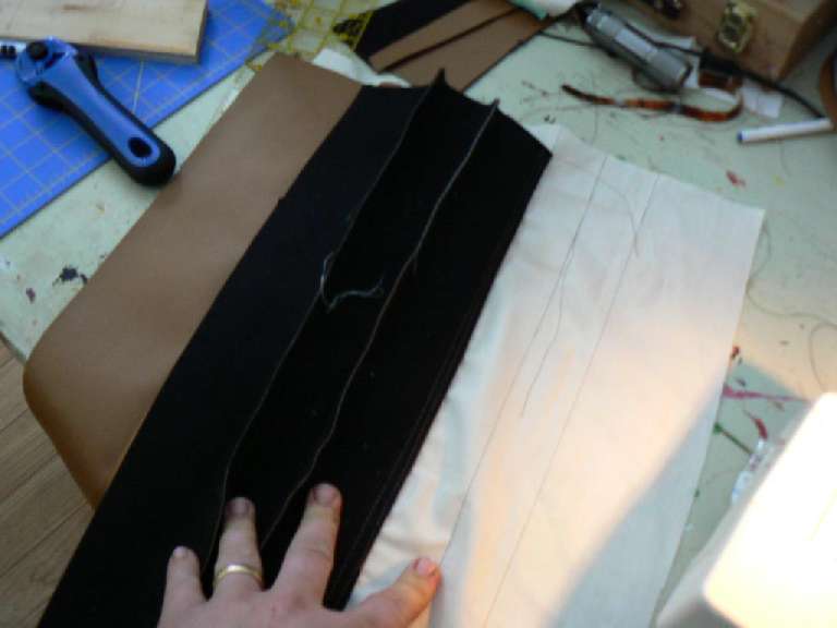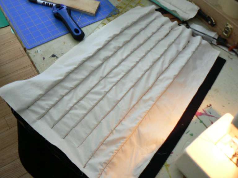 Making the seat covers - This is called Tuck & Roll - the vinyl is cut into 2" strips and seamed, then the muslin is sewn to the flaps after being marked at narrower intervals to create the pockets.