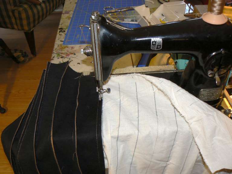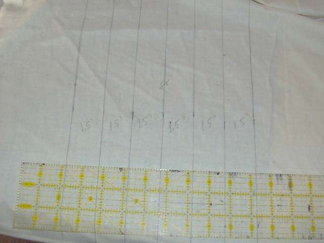 laying out the lines on the muslin for the tuck and roll. These are 1.5" wide, and the vinyl is 2" wide, creating the pockets. |