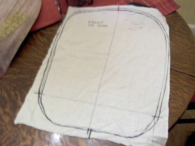 pattern for seat back - flip over for passengers side. I cut this out and traced it onto the assembled vinyl pieces, then cut them out to the (outer) line. The line at the bottom middle is the stopping point for the foam pieces. |