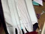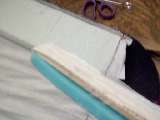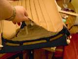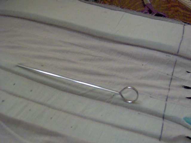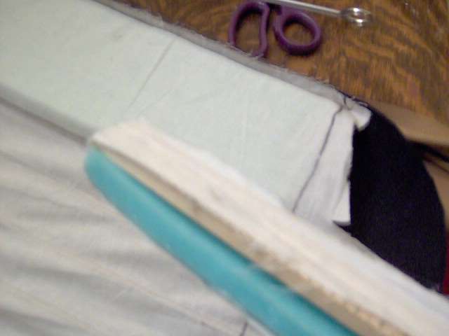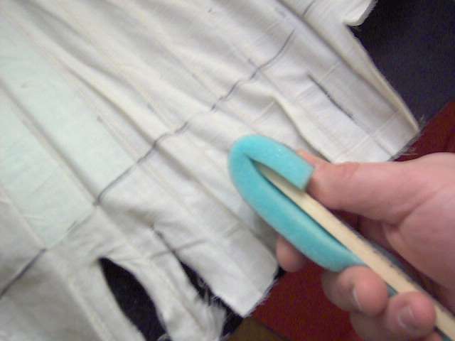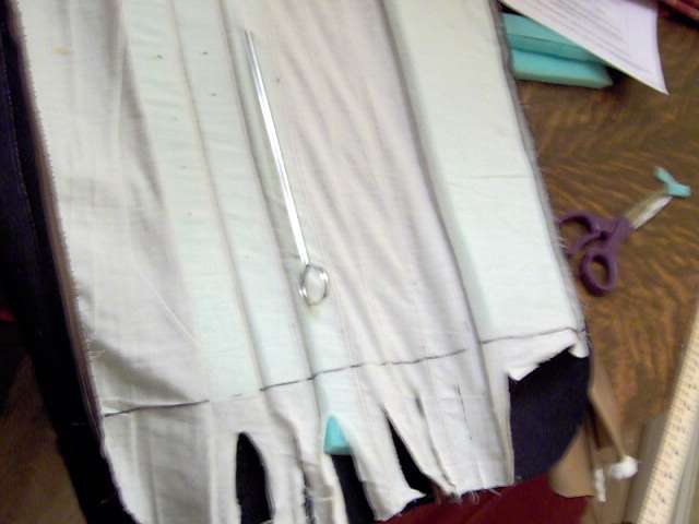 a "stuffing sock" with a yardstick - wrap muslin around the foam and the yardstick and it is easier to slide into the pockets. I ended up not using it in favor of just folding 2" of the foam over then end of the ruler - which was faster. |