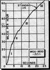 This new MG, as we pointed out earlier, gets up and goes. There isn't too much difference between this one and the 1500 in 0-30 and 0-40 timed but as the terminal speeds for each run went higher the times it took to reach those speeds dropped startlingly. The difference to 60 is over one-and-a-half-seconds, and the difference between the two in getting to 70 is three seconds exactly; to eighty is about seven seconds difference. The speed reached at the end of the standing quarter mile was 73 mph, some five miles an hour faster than earlier versions. This was reached in 18.8 seconds on at least one of several runs, a second quicker. Top speed on the best of several runs was 102 with the top down and with a full windshield. To reach this we had to head down the back stretch and into the famous bumpy banking at a shade better than 85 which the car would hold all the way around, accelerating as it came off and reaching terminal velocity at about a quarter mile down the straight. We saw a good bit more on the speedometer further along but had to discount it because of the downgrade which began just a little more than a quarter of a mole from the banking. The figures we saw, for what it was worth, was 112 before we shut off for the dropping turn at the end of the straight. If you go off this one you land on highway 31 at a highly illegal rate of speed and in somewhat the wrong direction for continued good health so 112 indicated downhill is all we can vouch for.