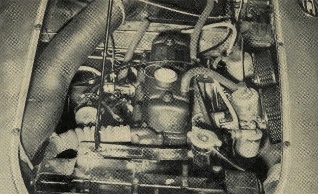 The modified BMC B-type engine is basically the same as the one that powers the four-cylinder Morris, Wolsley and Austin except for its more sporting camshaft and dual carbs. The compact gauze-type air cleaners do little or no silencing and the moan of air being dragged into the cylinders gets really loud at about 70 mph. On the whole this is a pleasant sound, suggestive of gobs of power, but when the weather equipment is up it can get tiresome.