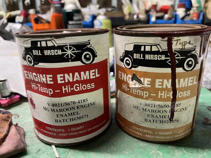 Rust-Oleum - gloss protective enamel - Merlot, Very close match to original MG Dark Red engine paint for MG Z and ZA Magnette, MGA, MGB. Discontinued after 2020. Found ion Amazon March 2025 in a 6-can case.