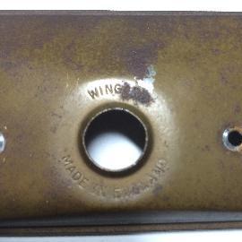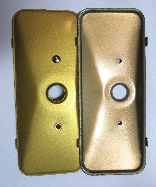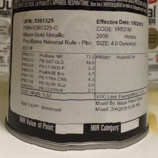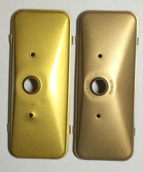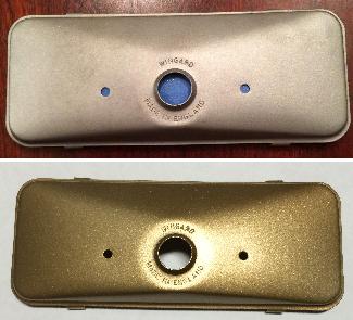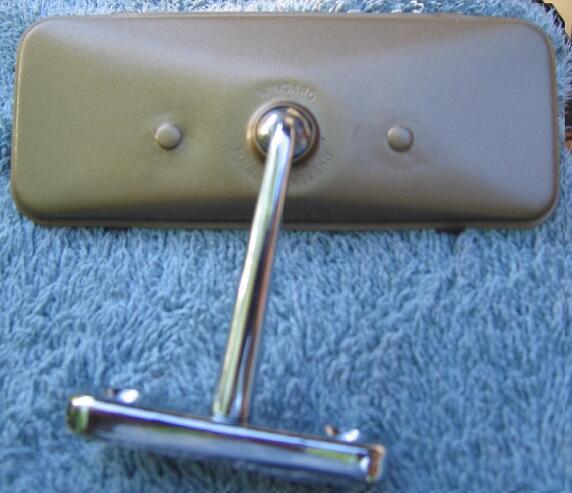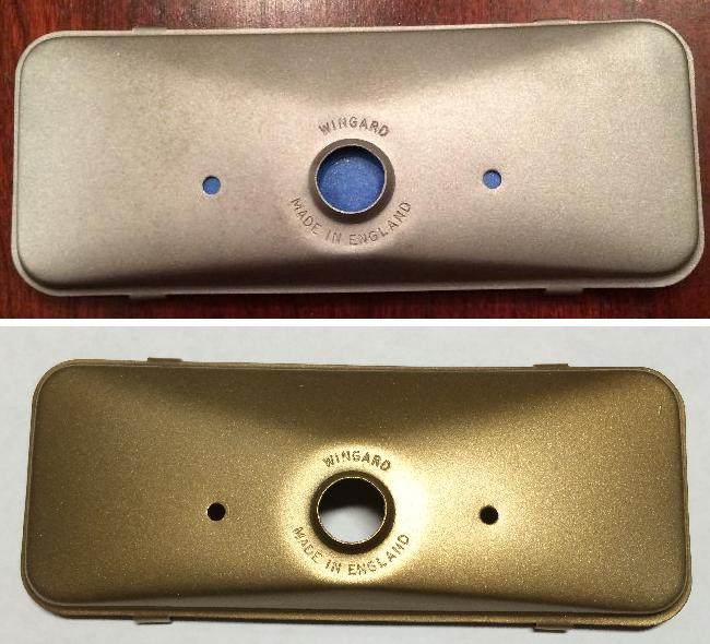"I went to the local NAPA Paint Store yesterday and asked them to match the paint color on the inside of my original Wingard dash mirror. The area was too small for them to computer match it so they picked what I think is a very close match from their paint samples. According to the label, it is called Blaze Gold Metallic for a 2000 Honda. I have attached pictures showing my original mirror housing before I bead blasted it, another one after I bead blasted it, one after I repainted it, and a couple comparing my original Wingard mirror housing to a new Moss reproduction mirror. I need to buy new semi-tubular rivets to reattach the plate on the inside that holds the swivel ball in place. I will then reattach the new mirror glass from the Moss repro and bend the tabs back down.