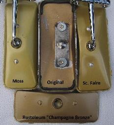 "One thing that I really wanted to do was to try to get the paint color as close as possible to original. Now in pic #1 the Moss color is on the left, Scarborough Faire (SF) on the right, the original Wingard color in the center, and on the bottom, the color I ultimately chose for my mirror. The Moss color was too light to my eyes, the SF is a bit darker, but neither really came close to original. Surprisingly, Rustoleum Metallic “Champagne Bronze” fit the bill".