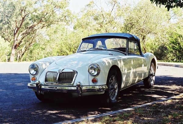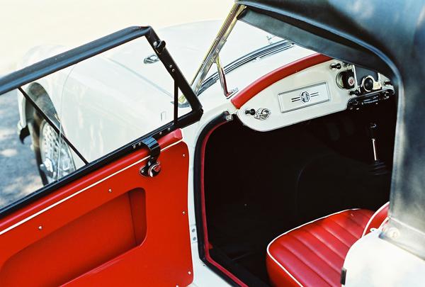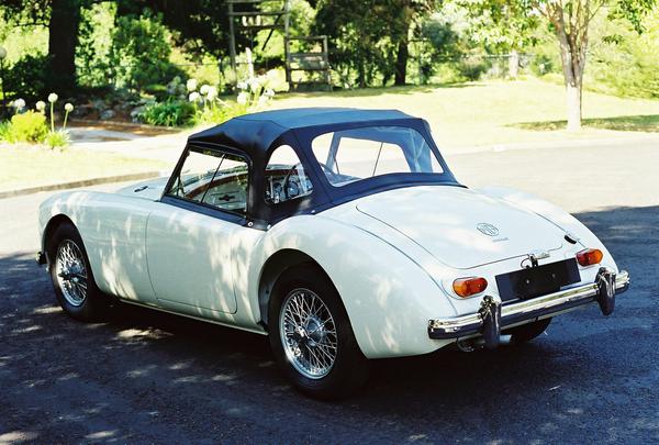"Note the painted dash; normal for the Australian assembled Mk II. Also the exposed wiring to the number plate light, running around the valence panel, again normal Australian MGA assembly practice. Australian assembled MGAs had vinyl, not leather seat trim. As far as I'm aware they all were supplied with black soft tops, no matter what the trim or body colour".