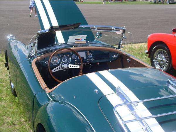 The next two were found at NAMGAR GT-40 in Frankenmuth, Michigan, in June 2015. On left, tastefully done complimentary Brown on Old English White. On right, high contrast Yellow on British Racing Green. With a slight knee-jerk reaction, on further reflection, I believe I have seen some Triumph TR4 or TR-250 with similar stripes (or maybe this style stripe just makes it look a bit like a TR).