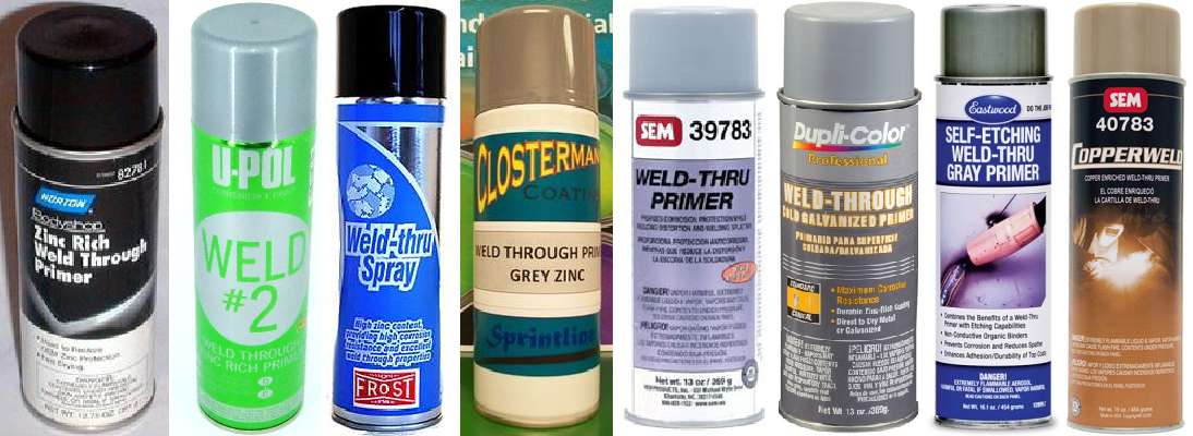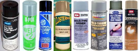 The weld through primer comes in a wide variety of brand names. The common variety has finely powdered zinc as the pigment, as much as 50% by weight in liquid form, and maybe 80% zinc after the solvents dry off. It is electrically conductive to enable welding after priming. My personal experience says it works very well for spot welding, and acceptably well for plug welding with a MIG welder on new sheet metal. Some other people report having some problems with sputtering or blow through using a MIG welder. The last can on far right in the picture is copper based weld through primer, which some folks say may cause less problems for MIG welding.