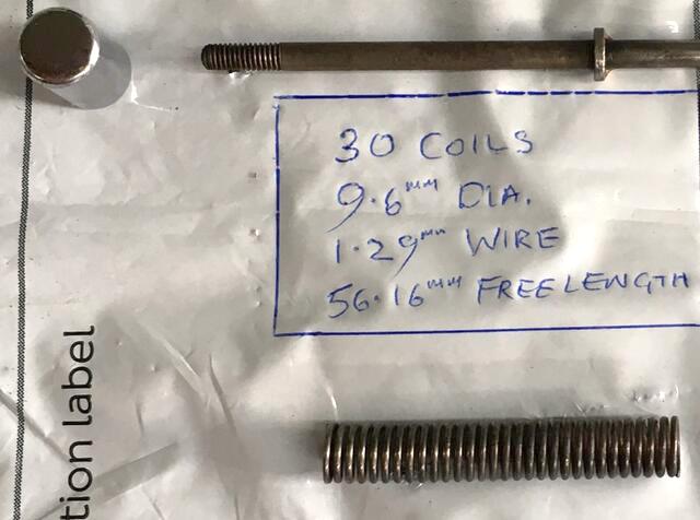 Image at right compliments of Mark Campbell in Grimsby, UK -- This spring fits inside the MGA hand brake lever for thumb button return. Imperial dimensions are: