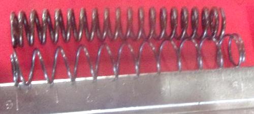 *Note: The spring supplied by Moss Motors (at time of this posting) is incorrect with 0.485" dia x 3" long with smaller wire diameter and only 10 active coils. It appears to fit under the edge of the button rather than inside the button. Picture at right is an oil pressure release spring, and the incorrect Moss thumb button spring.