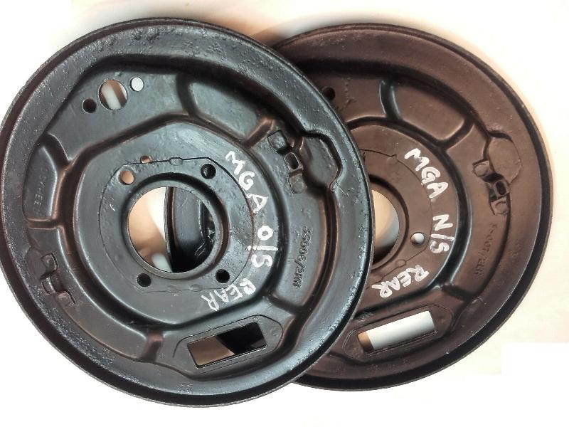 Rear brake backing plates for MGA. Difference between left and right is orientation (clocking) of the four mounting holes at the center hub.