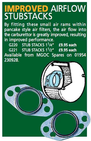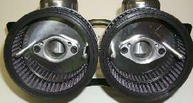 Several companies make velocity stacks, which replace and eliminate the air filters. Most of the manufacturers are copying other products improperly and therefore produce velocity stacks that look cool but don't work. I have only found one good manufacturer, TWM, that makes proper units that do work. Moss, APT, and TWM sell them in two versions, short and long. The long ones give you about 2HP more at the wheels, but won't clear the brake booster on a late MGB. The short ones will, and give you about 1 HP at the wheels. The TWM units are extruded aluminum with a rolled radius around the bell. Cheaper units (that have no effect or cost HP) are stamped with a sharp edge around the bell.